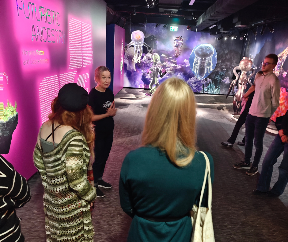 Ühiselt külastati ka Fotografiskas kosmoseteemalist näitust, kus toimus giidituur soome keeles — ideaalne võimalus kuulata, mõista ja praktiseerida keelt päris olukorras. Külaskäigu raames avastati, kui palju üksteiselt õppida on.